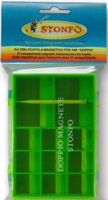 A Stonfo Double Magnetic Box egy dupla mágneses doboz, rendkívül ellenálló és tartós műanyagból készült, amely ajánlott fém horgász kellékek (horog, kapocs, forgó stb.) tárolására. A doboz két oldalas, és 31 mágneses rekesszel rendelkezik. Az átlátszó fedők lehetővé teszik a doboz tartalmának gyors áttekintését.