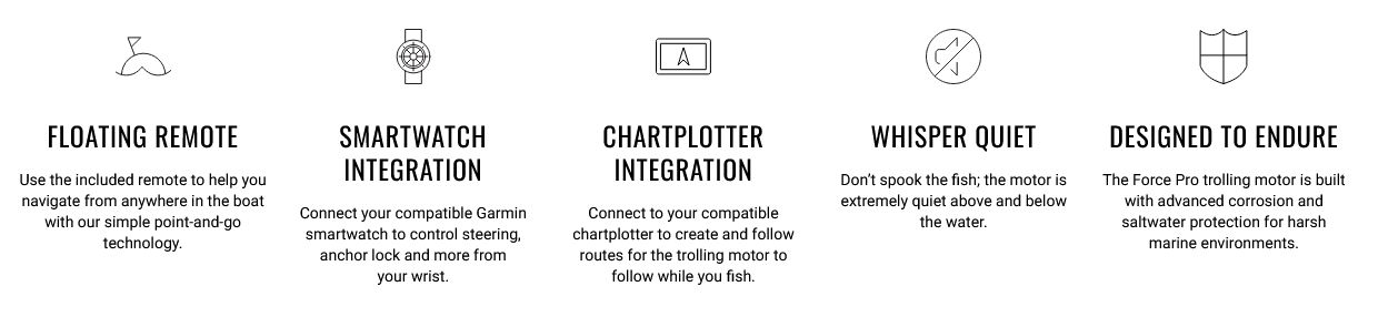A Force Pro a Garmin csúcs trolling motorja, amelyet maximális teljesítményre és pontosságra terveztek. Kefe nélküli motorral és akár 100 lbs (≈ 45 kg) tolóerővel rendelkezik, páratlan erőt és csendességet kínálva. Több sávos GPS-zel és továbbfejlesztett Anchor Lock funkcióval — beleértve az elfordulás visszafordítását és a kábel automatikus leválasztását — pontos pozicionálást biztosít még nehéz körülmények között is. A beépített GT56UHD-TR transzducer lehetővé teszi a zajcsökkentett UHD sonar magas felbontású szkennelését, míg a vezeték nélküli rendszer (pedál, gesztusvezérelt távirányító) intuitív távoli irányítást tesz lehetővé. A gázzal működő dupla rugós ollós szerelés és a masszív kábel megkönnyíti a telepítést, miközben a fejlett korrózióvédelem és az IPX7 vízállóság tartósságot garantál agresszív környezetben.
