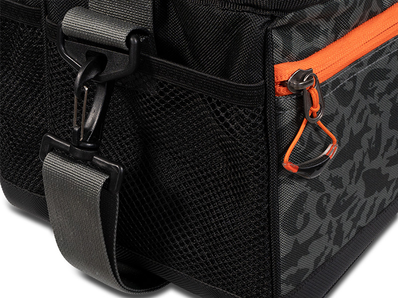 A kiváló minőségű cipzárok narancssárga színűek, műanyag húzóval narancssárga zsinóron. A húzók szélesebbek a végükön a könnyebb kezelhetőségért. A narancssárga kiegészítők kiváló láthatóságot biztosítanak szürkületben vagy ködben. A táska fekete anyagból készült, könnyű, mégis strapabíró. A jobb kényelem érdekében fekete vállpánttal rendelkezik. Egyedi Darx ATAK! álcázással van borítva, amely ragadozóhal sziluetteket ábrázol.